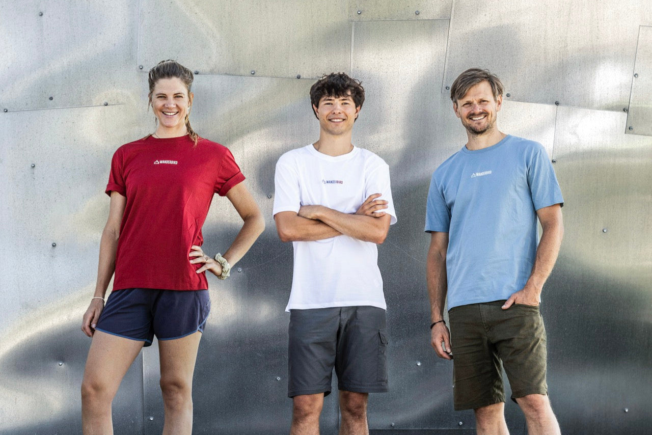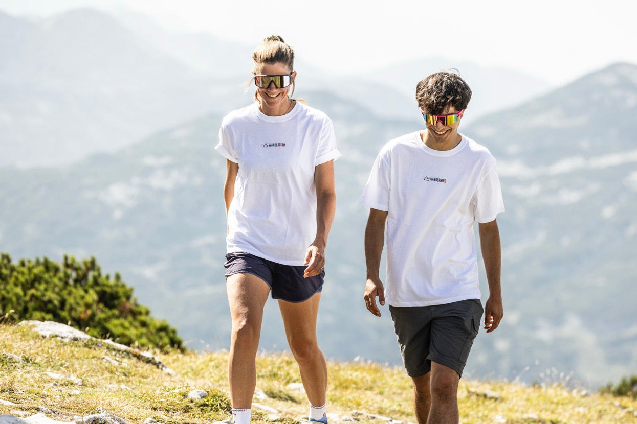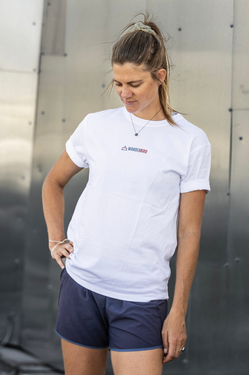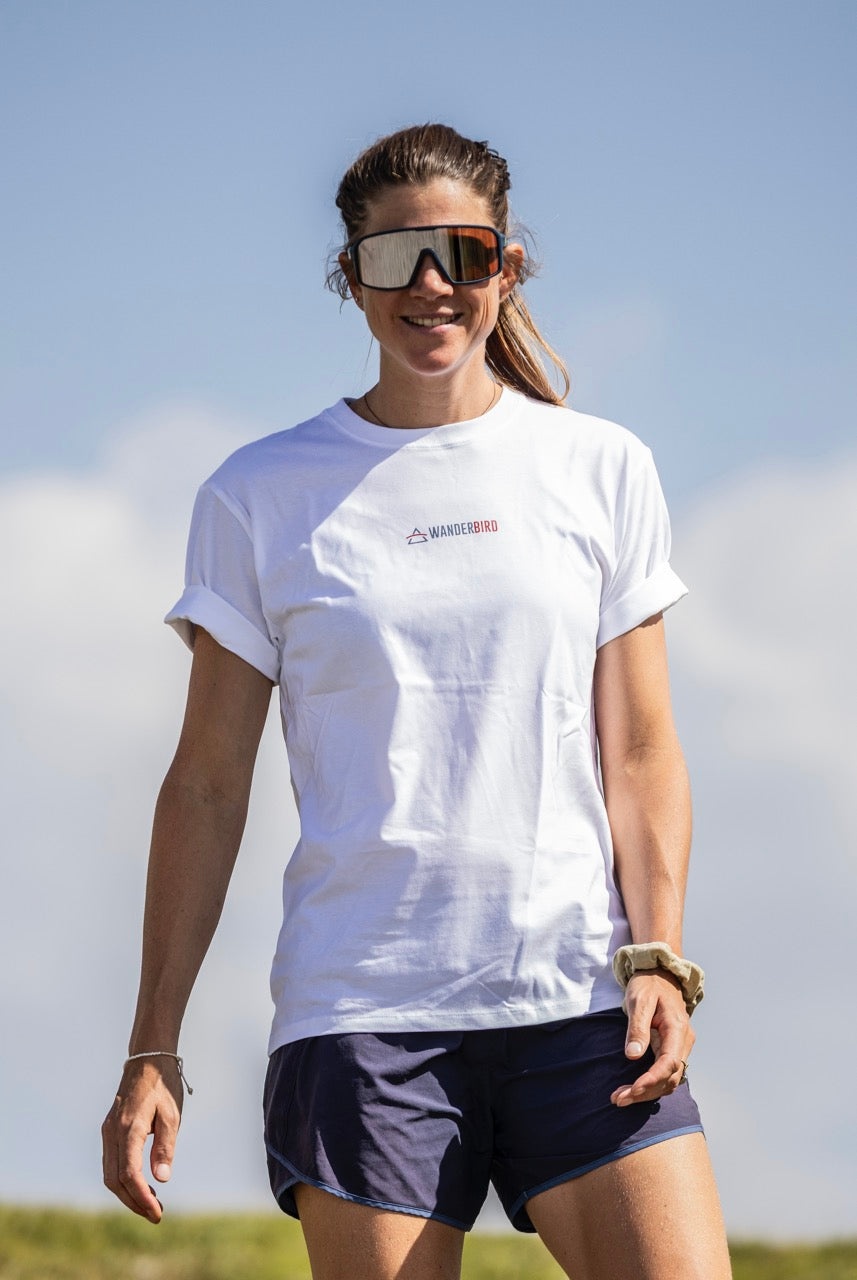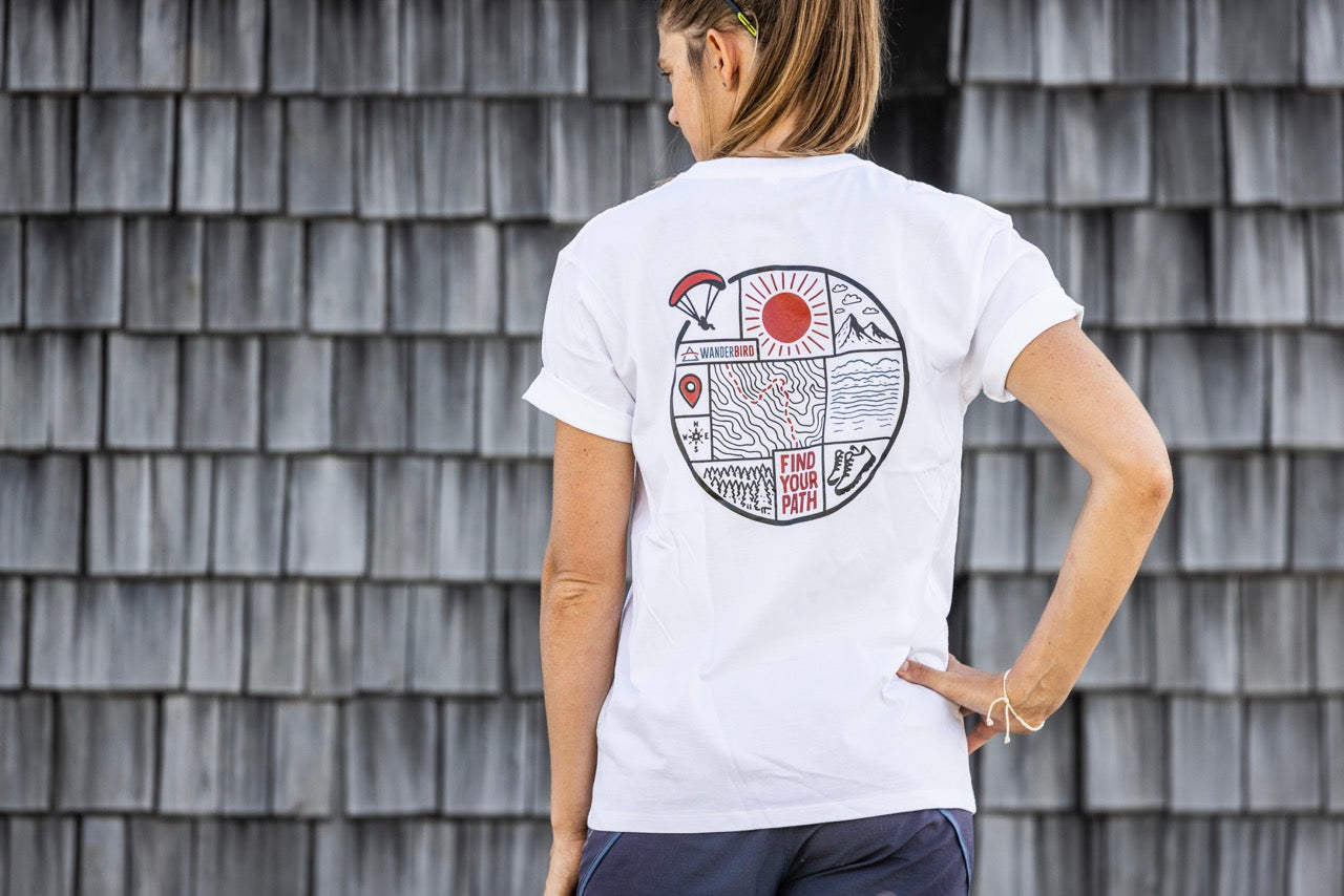 Baumwoll Shirt mit WANDERBIRD Schriftzug vorne und Hike&Fly Print hinten.